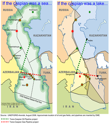 Mezinárodní právo status Kaspického moře jasně nevymezuje, avšak poskytuje prostor pro společnou dohodu, je tedy možné označit tuto vodní plochu za moře, pakliže se na tom státy dohodnou nehledě na rozlohu a geografické charakteristiky[5]. Pokud by se jednalo o moře, řídilo by se jeho rozdělení Úmluvou OSN o mořském právu z roku 1982, což znamená, že pobřežní státy mají své teritoriální moře s šířkou maximálně 12 námořních mil od pobřeží a kontinentální šelf. Teritoriální moře pak nepřesáhne za středovou linii, která určuje šířku teritoriálních vod. Pokud by se jednalo o jezero, pak se jeho rozdělení řídí dle práva Mezinárodního obyčeje, což znamená, že státy hraničící s vodní plochou s ní budou hospodařit na základě mezinárodních dohod. Každý stát získá exkluzivní právo na zdroje a vodní hladinu ve svém národním sektoru[6]. Sovětsko-íránské rozdělení lze tedy považovat za jaksi hybridní, neboť oba státy vodní plochu považovaly za moře, ale SSSR si svou část rozdělil do sektorů dle svých republik, což odpovídá statusu jezera.